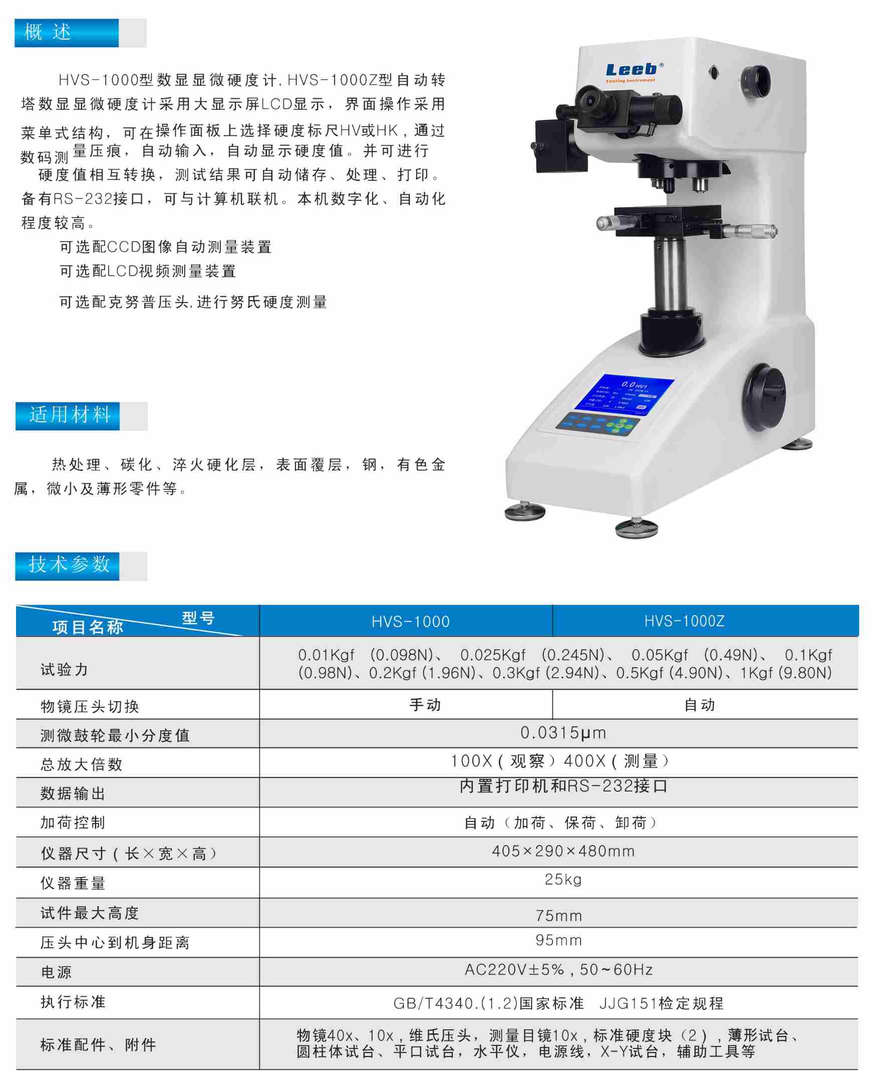 HVS-1000型數(shù)顯顯微硬度計,HVS-1000Z型自動轉塔數(shù)顯顯微硬度計采用大顯示屏LCD顯示,界面操作采用菜單式結構,可在操作面板上選擇硬度標尺HV或HK,通過數(shù)碼測量壓痕,自動輸入,自動顯示硬度值。