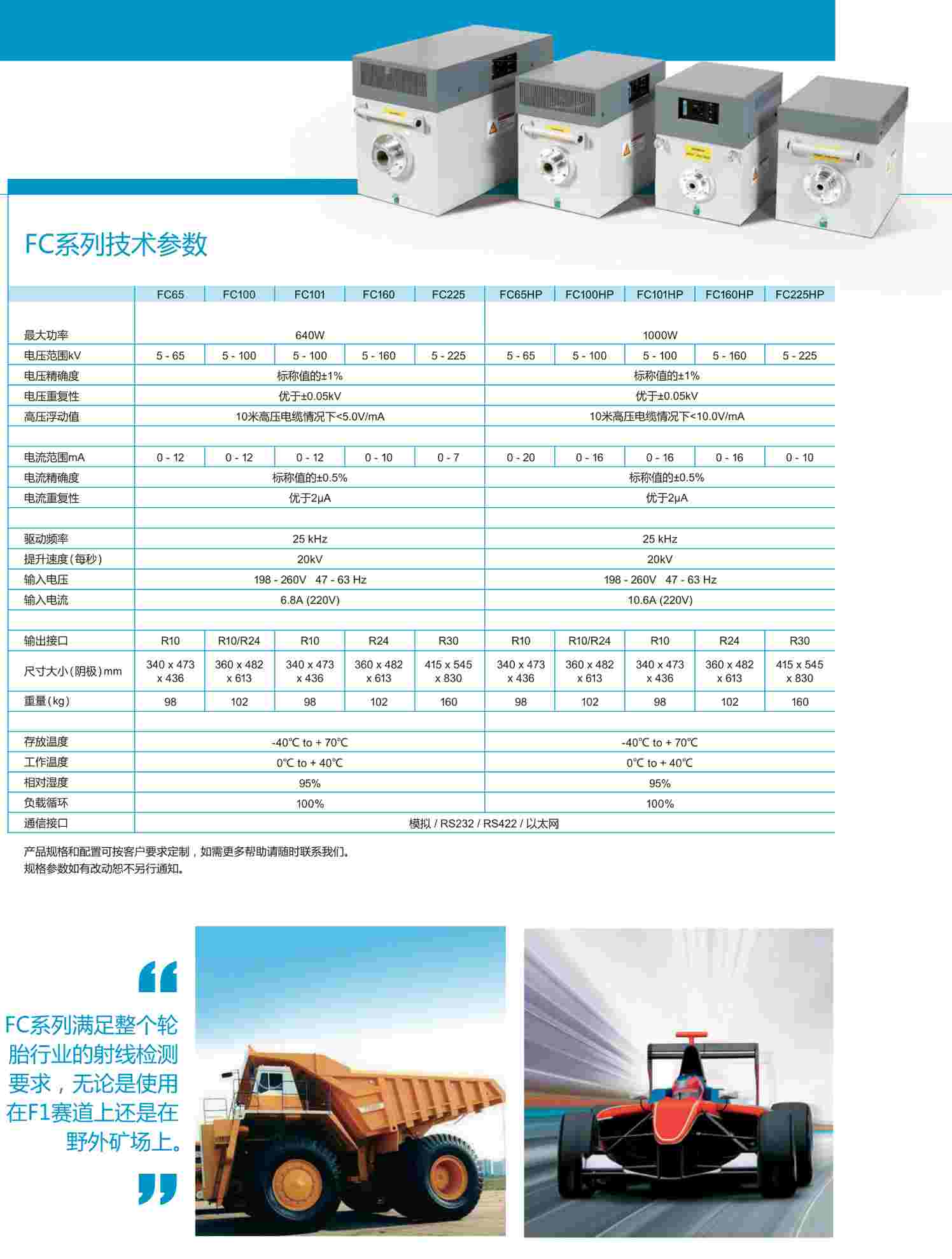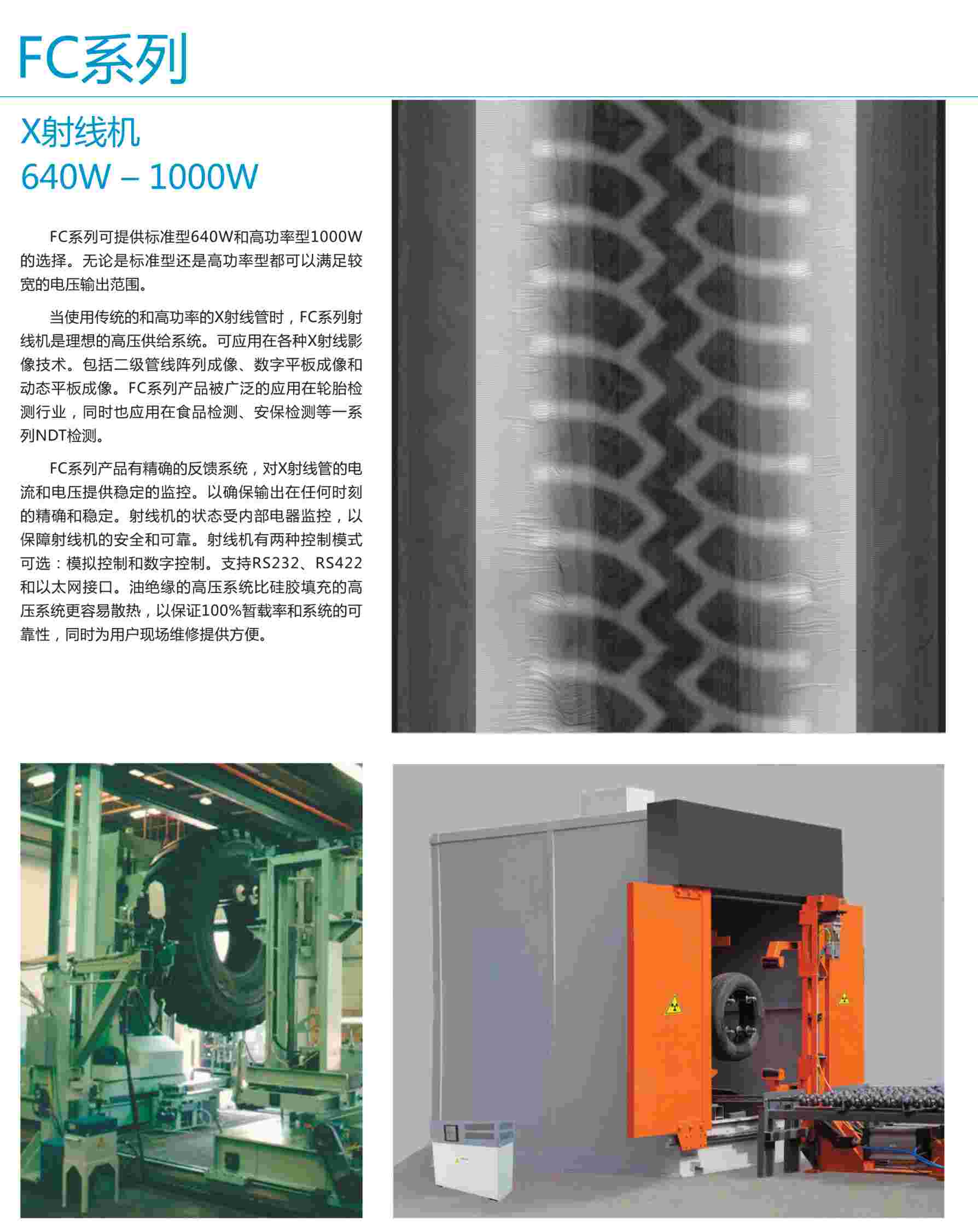 當使用傳統(tǒng)的和高功率的X射線管時,F(xiàn)C系列射線機是理想的高壓供給系統(tǒng)??蓱迷诟鞣NX射線影像技術。包括二極管線陣列成像、數(shù)字平板成像和動態(tài)平板成像。FC系列產品被廣泛的應用在輪胎檢測行業(yè),同時也應用在食品檢測、安保檢測等一系列NDT檢測。