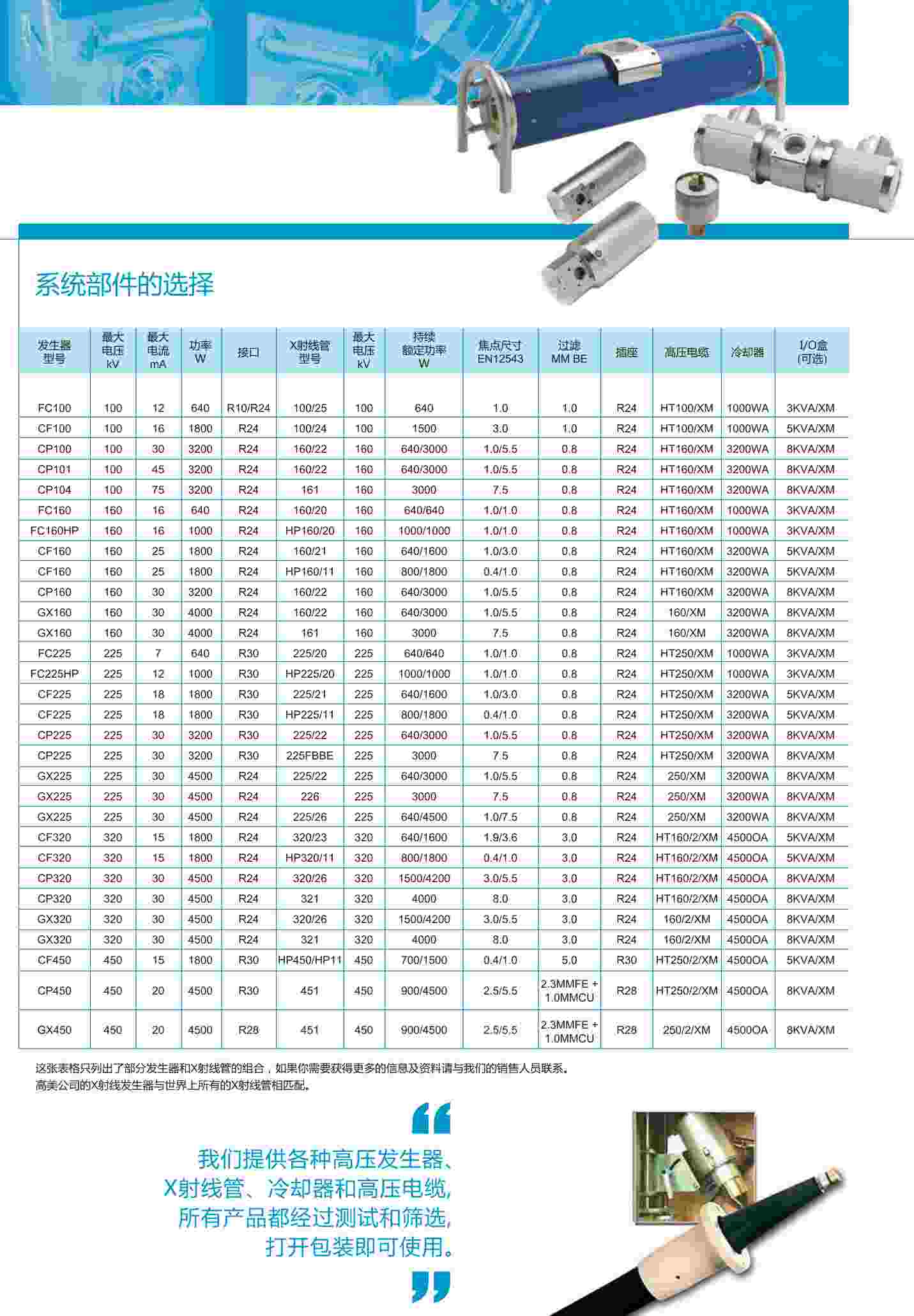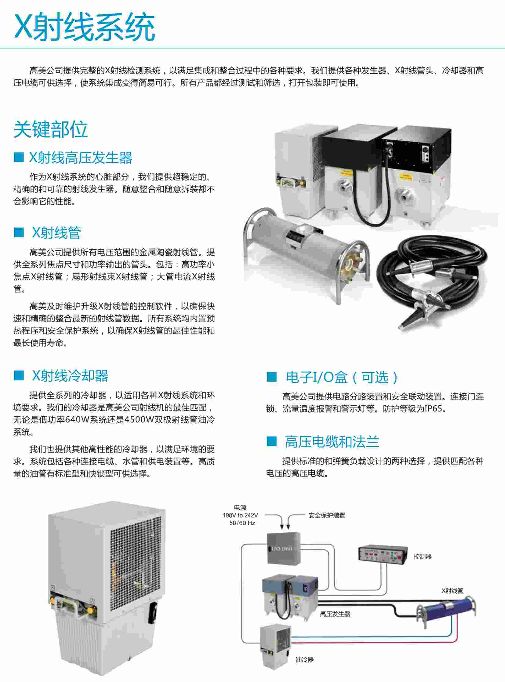 高美公司提供完整的X射線檢測系統(tǒng),以滿足集成和整合過程中的各種要求。我們提供各種發(fā)生器、X射線管頭、冷卻器和高壓電纜可供選擇,使系統(tǒng)集成變得簡易可行。所有產(chǎn)品都經(jīng)過測試和篩選,打開包裝即可使用。