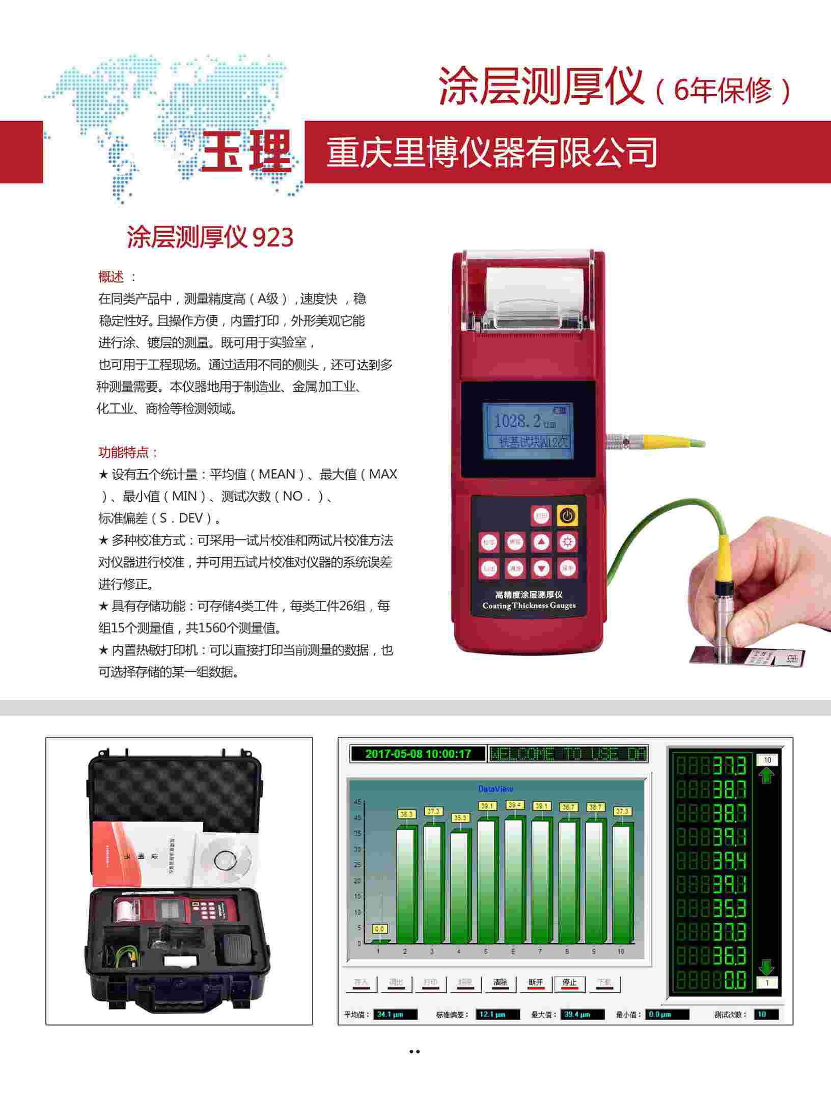 在同類產(chǎn)品中,測量精度高,速度快,穩(wěn)定性好,且操作方便,內(nèi)置打印,外形美觀它能進行涂、鍍層的測量。既可用于實驗室,也可用于工程現(xiàn)場。通過適用不同的側(cè)頭,還可達到多種測量需要。本儀器用于制造業(yè)、金屬加工業(yè)、化工業(yè)、商檢等檢測領(lǐng)域。本儀器符合以下標準:GB/T 4956-1985磁性金屬基體上非磁性覆蓋層厚度測量,磁性方法;GB/T 4957-1985非磁性金屬基體上非導(dǎo)電覆蓋層厚度測量,渦流方法。JB/T 8393-1996磁性和渦流式覆層厚度測量儀JJG 889-95《磁阻法測厚儀》 JJG818-93《電渦流式測厚儀》