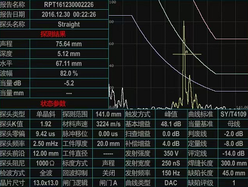 五、 探傷方式及探頭選擇:檢測焊縫的缺陷,推薦使用橫波斜探頭進行檢測,探頭參數(shù)根據(jù)焊縫母材厚度進行選擇,此處工件母材厚度20mm,選擇5P13*13K2的單斜探頭。