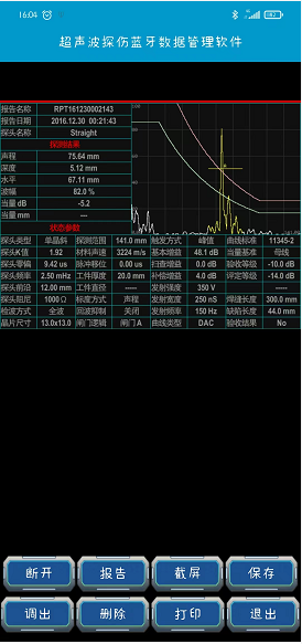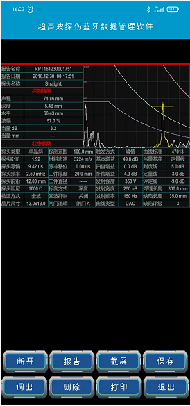 焊接接頭檢測過程中,可以實時在儀器內保存探傷報告并通過藍牙連接傳輸?shù)绞謾C上,通過手機App截屏,并可以現(xiàn)場連接藍牙打印機打印實時打印探傷報告。