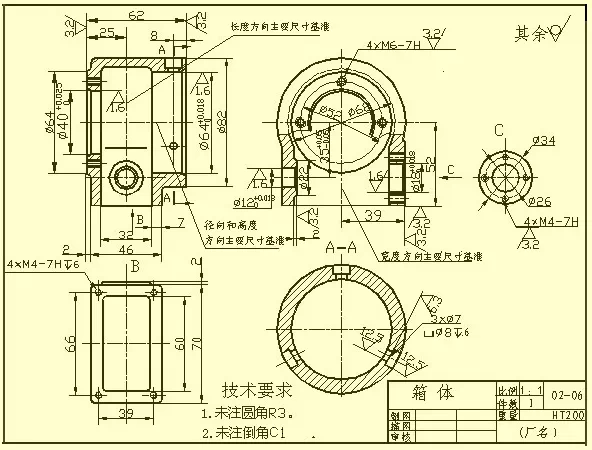 這類零件一般有撥叉、連桿、支座等零件。由于它們的加工位置多變,在選擇主視圖時,主要考慮工作位置和形狀特征。對其它視圖的選擇,常常需要兩個或兩個以上 的基本視圖,并且還要用適當?shù)木植恳晥D、數(shù)控微信公號cncdar斷面圖等表達方法來表達零件的局部結(jié)構(gòu)。踏腳座零件圖中所示視圖選擇表達方案清晰對于表達軸承和肋的寬度來說,右視圖