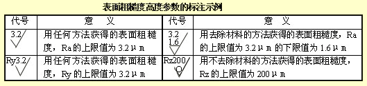 表面粗糙度高度參數(shù)Ra、Rz、Ry在代號中用數(shù)值標注時,除參數(shù)代號Ra可省略外,其余在參數(shù)值前需標注出相應的參數(shù)代號Rz或Ry,標注示例