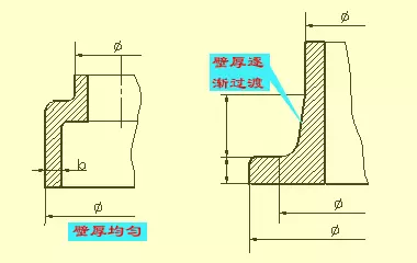 當鑄件的壁厚不均勻時,鑄件在澆鑄后,因金屬冷卻速度不同,將產(chǎn)生裂紋和縮孔現(xiàn)象。因此,鑄件的壁厚應盡量均勻,見上圖;當采用不同壁厚連接時,應采用逐漸過渡的方式,見上圖。鑄件的壁厚尺寸一般采用直接注出。