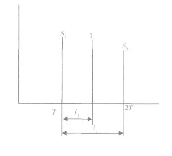 2.2.1 如圖4 所示, “山形回波”中L 波與S2 波聲程相近, 但L 波為變型縱波, 而縱波聲速遠(yuǎn)大于橫波聲速, 所以在熒屏上L 波落在S2 波之前。以鋼焊縫為例, 其縱波聲速CL=5 900 m/s, 橫波聲速CS=3 230 m/s, 設(shè)L 波與S2 波聲程相等, 則l1/l2=CS/CL=0.55(l1、l2 見圖5), 即在熒光屏上, L 波位于S1 與S2 波之間距的0.55 倍處( 與S1 的距離) 。而S2 波在熒屏上的具體位置則與定位方法有關(guān)。設(shè)S2 波的實(shí)際聲程為SⅡ, 則: