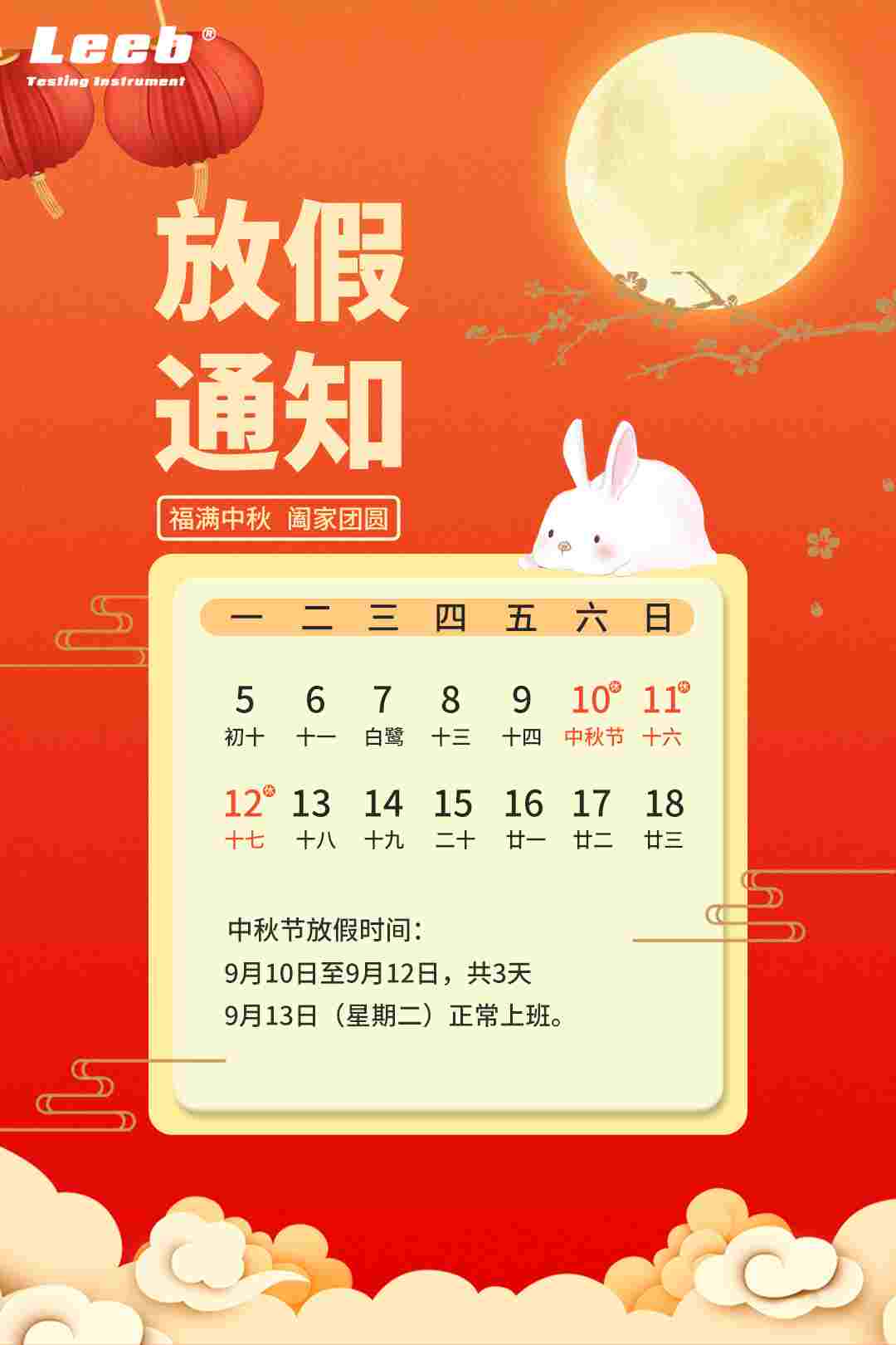 中秋節(jié)放假時間:9月10日至9月12日,共3天。9月13日(星期二)正常上班。放假期間,公司正常接單,在9月13號陸續(xù)發(fā)貨。