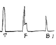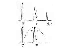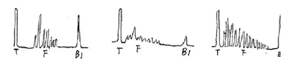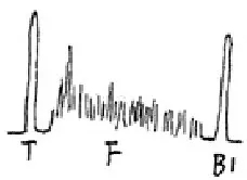 軸類鍛件中的縱向內(nèi)裂,直探頭圓周探傷,聲束平行于裂紋時,既無底波也無傷波,當(dāng)探頭轉(zhuǎn)動90°時反射波最強(qiáng),呈現(xiàn)裂紋波形,有時會出現(xiàn)裂紋的二次反射,一般無底波。底波與傷波出現(xiàn)特殊的變化規(guī)律(如圖)。