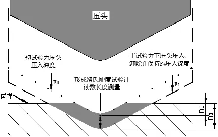 用金剛石圓錐或淬火鋼球壓頭,在試驗(yàn)壓力F的作用下,將壓頭壓入材料表面,保持規(guī)定時(shí)間后,去除主試驗(yàn)力,保持初始試驗(yàn)力,用殘余壓痕深度增量計(jì)算硬度值,實(shí)際測(cè)量時(shí),可通過(guò)試驗(yàn)機(jī)的表盤直接讀出洛氏硬度的數(shù)值。