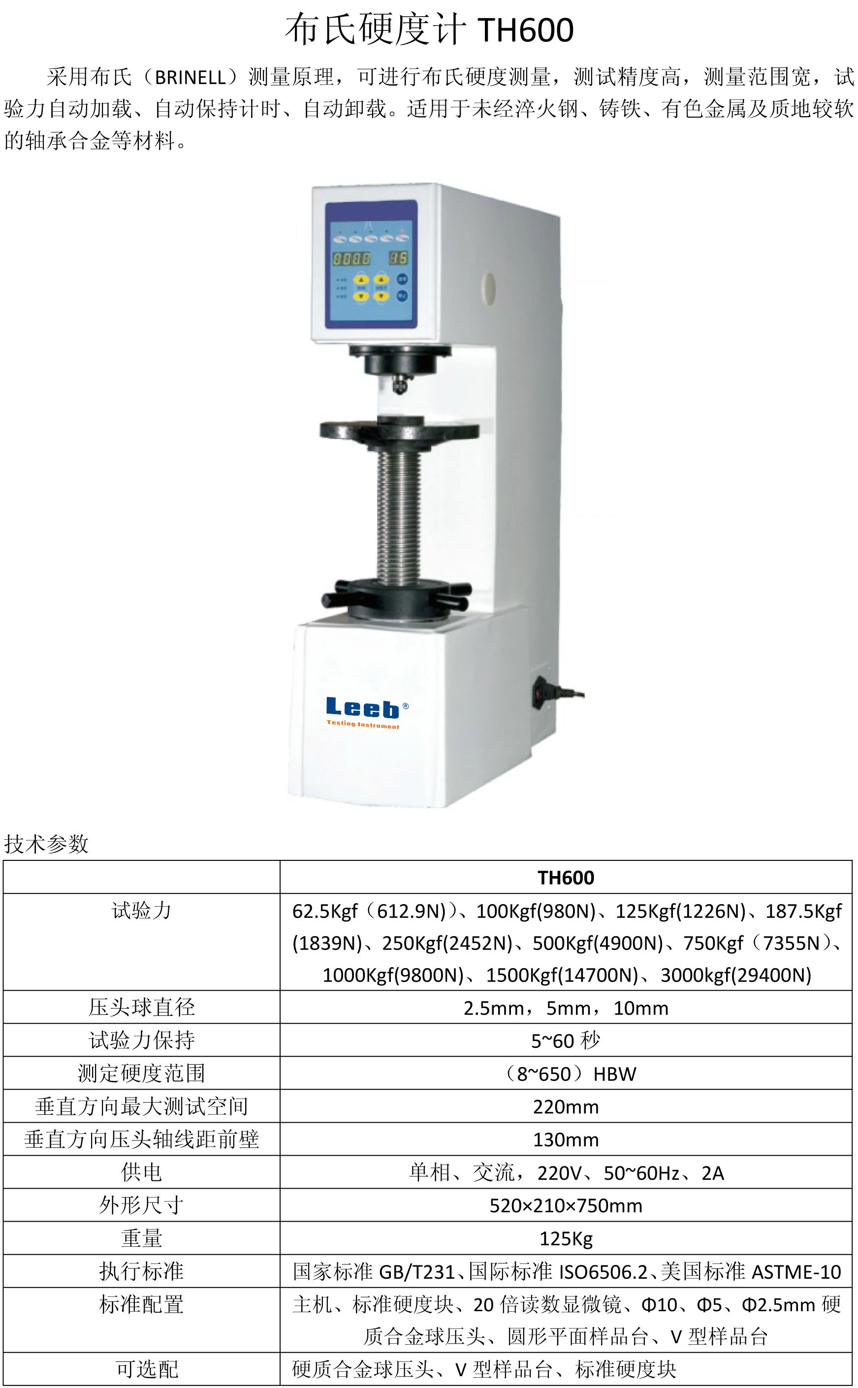 采用布氏(BRINELL)測量原理,可進(jìn)行布氏硬度測量,測試精度高,測量范圍寬,試驗(yàn)力自動加載、自動保持計時、自動卸載。