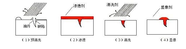 滲透檢測原理是基于液體的毛細現(xiàn)象,和固體染料在一定條件下的發(fā)光現(xiàn)象為基礎(chǔ),進而進行對檢測工件表面缺陷分析判斷。在毛細作用下,經(jīng)過一定時間,滲透劑可以滲入表面開口缺陷中;去除工件表面多余的滲透劑,經(jīng)過干燥后,再在工件表面施涂吸附介質(zhì)——顯像劑,在一定光源下(紫外線光或白光),缺陷處的滲透液痕跡被顯示(黃綠色熒光或鮮艷的紅色),從而探測出缺陷的形狀及分布狀況。滲透探傷有著色滲透和熒光滲透方法,廣泛應(yīng)用于黑色和有色金屬鍛件、鑄件、焊接件、機加工件以及陶瓷、玻璃、塑料等表面缺陷的檢查。它能檢查出裂紋、冷隔、夾雜、疏松、折疊、氣孔等缺陷;但對于結(jié)構(gòu)疏松的粉末冶金零件及其他多孔性材料不適用。